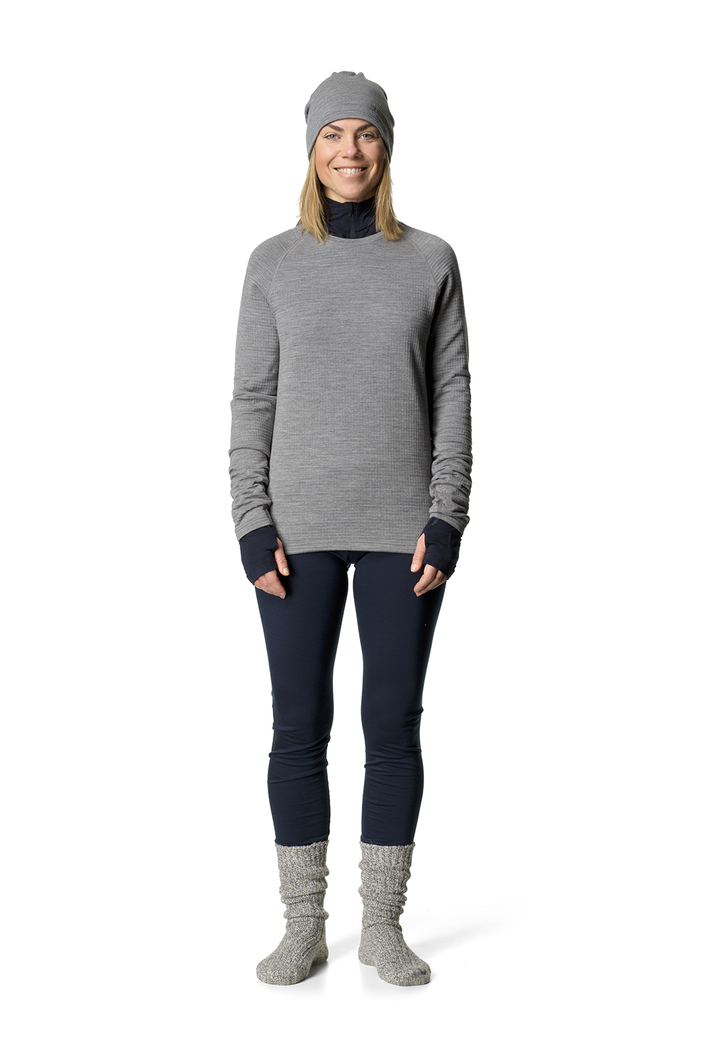 HOUDINIのベースレイヤーはすべてメリノウール100%だが、ただ厚みが違うというだけでなく、それぞれの生地感の違いを楽しめる。 薄手の「Desoli Light」、中厚の「Desoli Mid」、厚手の「Desoli Thermal 」、とくに「Desoli Mid」の質感はウールとは思えないようなコシがあり、「Desoli Mid Crew」は普段着としても良さそう。