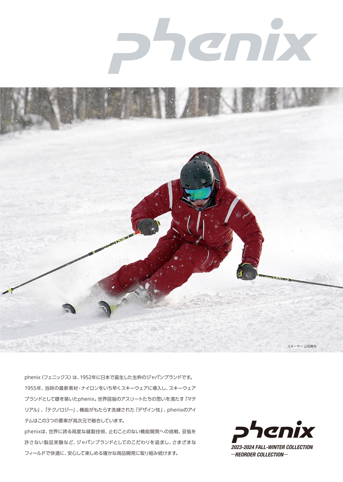 「phenix」は、1952年に日本で誕生し、これまで1955年当時の最新素材・ナイロンをいち早くスキーウエアに導入し、スキーウエアブランドとしての礎を築いた。1978年のダウラギリ遠征(8167m)では、国内で初めてヒマラヤの超高所に耐えうるダウンウエアを開発し登頂をサポート。近年では、技術力の高さが認められオリンピック日本代表選手に製品供給を行ったり、世界トップレベルを誇るノルウェーアルぺンスキーチームのオフィシャルサプライヤーとして、長年、最先端のスキーウェア製作を行う。ブランド創設70年を迎える今も世界を席巻するブランドとして展開している。