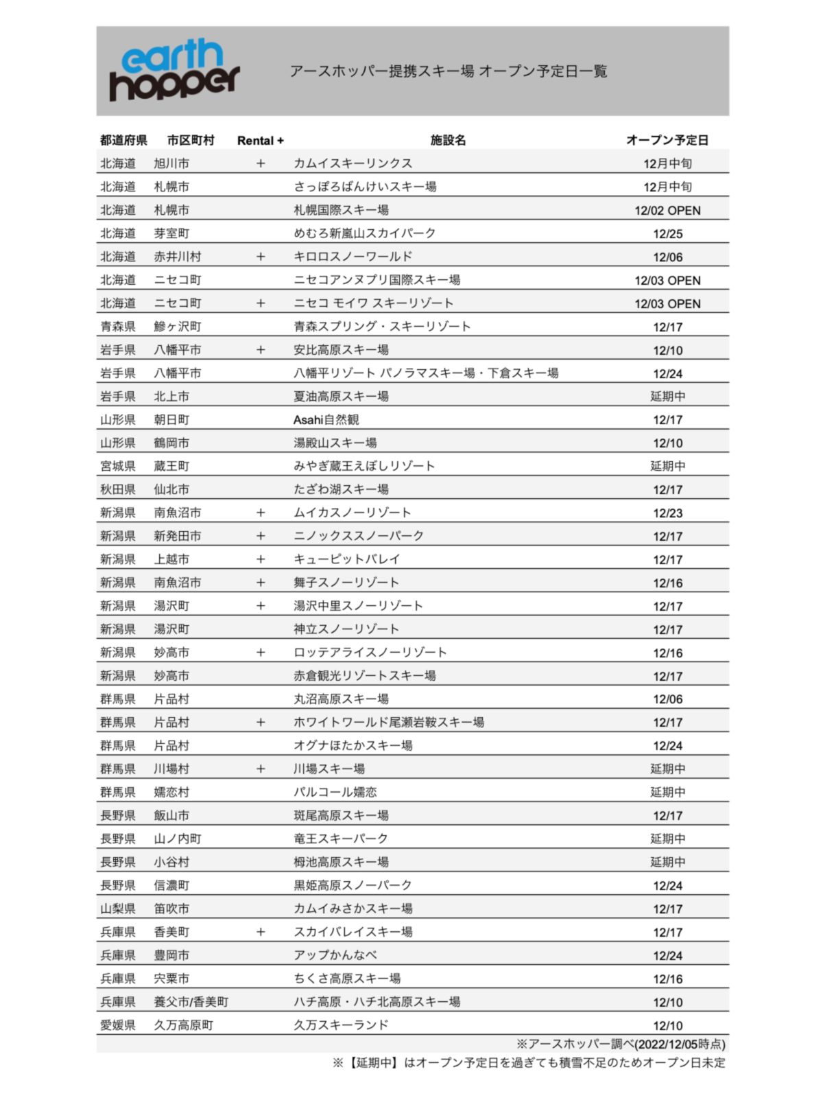 また、アースホッパー独自で公表している「提携スキー場オープン予定日一覧」も公開。まだ積雪が見込めず、オープンを延期しているところも多いが、それぞれのスキー場の状況をチェックし、ホッピング計画に役立てよう。