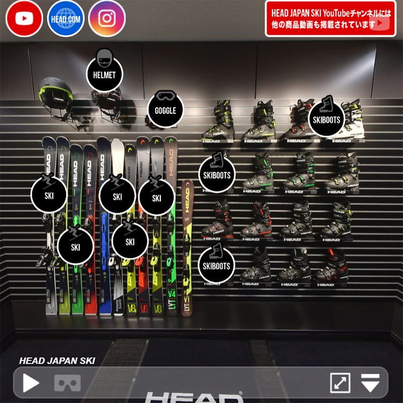スキー・ブーツ・ゴーグル・ヘルメットのアイコンをクリックすると、You tube動画に繋がり、HEADスタッフが最新モデルの特長や魅力を説明してくれる。