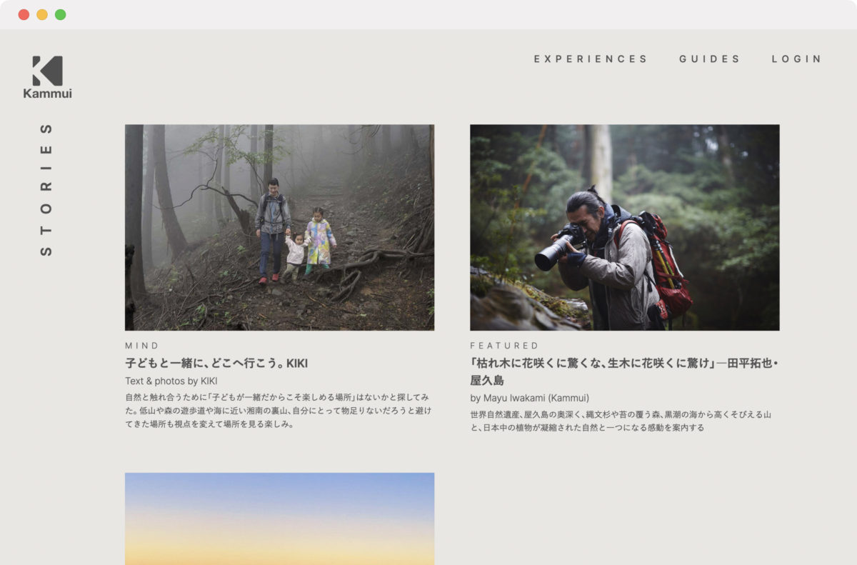 kammui.com内では「Kammui Stories」として、アウトドア体験を発信するメディアコンテンツも今後充実していく予定だ。アウトドア体験の紹介記事やハウツーガイド、著名人による自然に関する考察記事、厳選されたガイドの紹介映像まで、日常にもアウトドアな要素を取り入れるきっかけとしている。