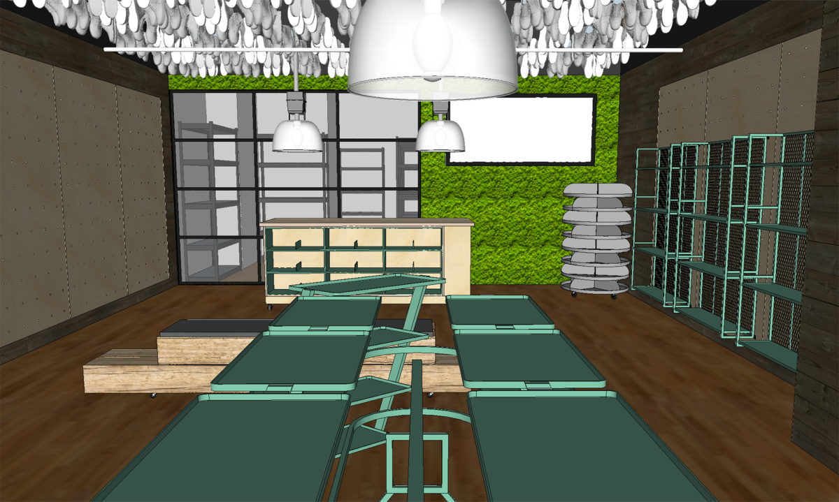 ガレージ&ファクトリーをイメージした店舗の外観、内装はリユース素材を多く使用。旧店舗で使用の木扉や、タイの向上でシューズ製造ラインに使われていたコンベヤを店頭ディスプレイ什器に再利用したり、サンプルのシューズを天井ディスプレイに取り入れるなど、遊び心溢れるつくりになっている。