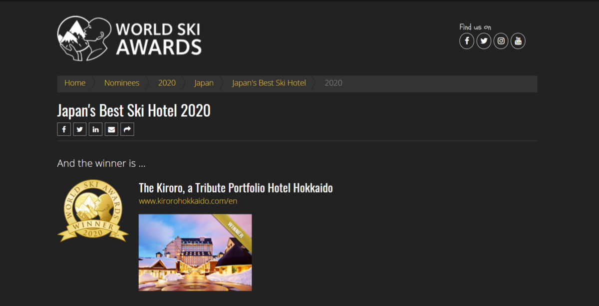 「Japan’ s Best SKI HOTEL 2020」部門の最優秀賞に輝いたのは、THE KIRORO, A TRIBUTE PORTFOLIO HOTEL(キロロトリビュートホテル)となった。
