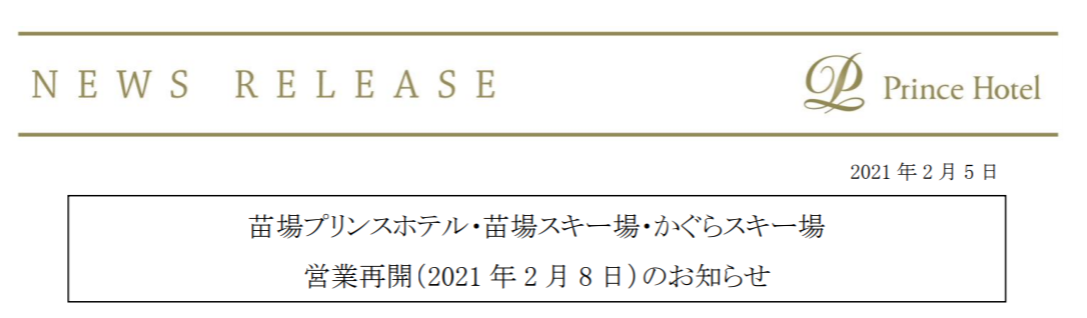 ※苗場プリンスホテルは 2 月 8 日(月)のチェックインより営業再開させていただきます。