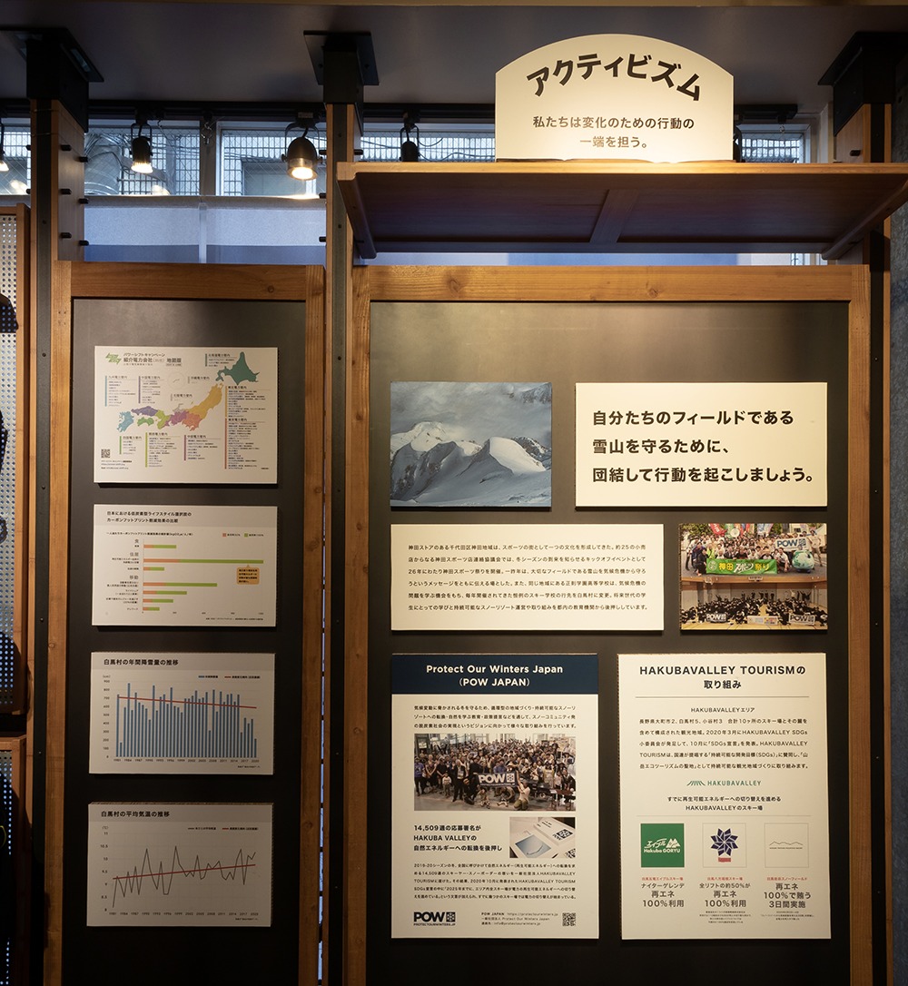 さらには、「ACTIVISM(アクティビズム) 」と称して「私たちは変化のための行動の一端を担う。」というスローガンとともに、店内で雪山を守るために気候危機の現状や、各スノーエリアで立ち上がっている気候危機に対する取り組みの情報を発信。一般社団法人 POW Japanの情報なども掲示する。