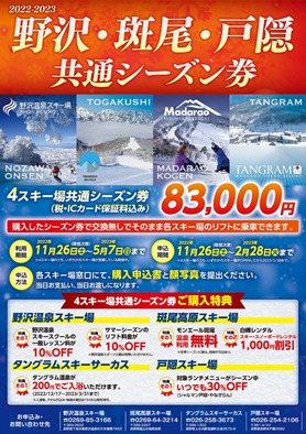 昨シーズンも大好評だった野沢・斑尾・戸隠エリア内の4スキー場で使える共通シーズン券が今年も9月15日(木)より販売を開始した。
