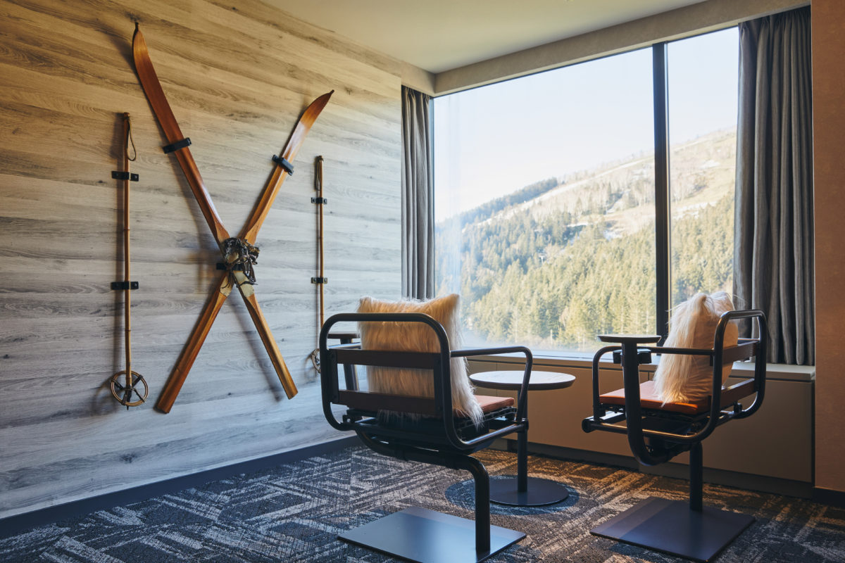 ゲレンデを見渡せる窓際には以前トマム スキー場で実際に使用していた「シングルリフトチェア」を椅子にリメイク。さながらリフトに乗っている感覚を客室で味わえる、という何とも乙な魅力がある。さらに昔懐かしい木製のスキーとストックがあしらわれたオブジェも設置。