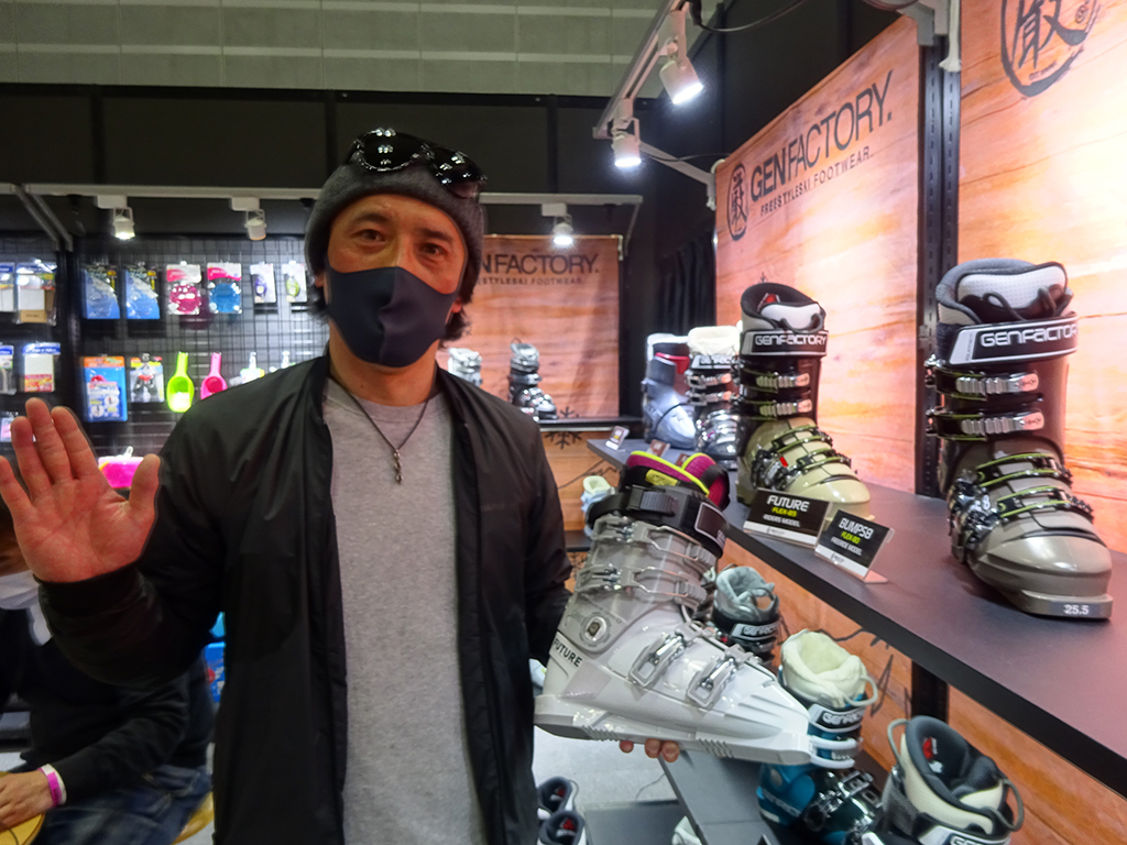 ブースに立ち寄るとGENライダー佐々木徳教が、ブーツを履いてアテンド中。北海道の大雪の話に始まり、レジェンドスキーヤーならではのギアの進化やライディングスタイルのルーツなど、興味深い話が尽きないなか、来季モデルのトピックとして、新たなラインが登場したことを教えてくれた。