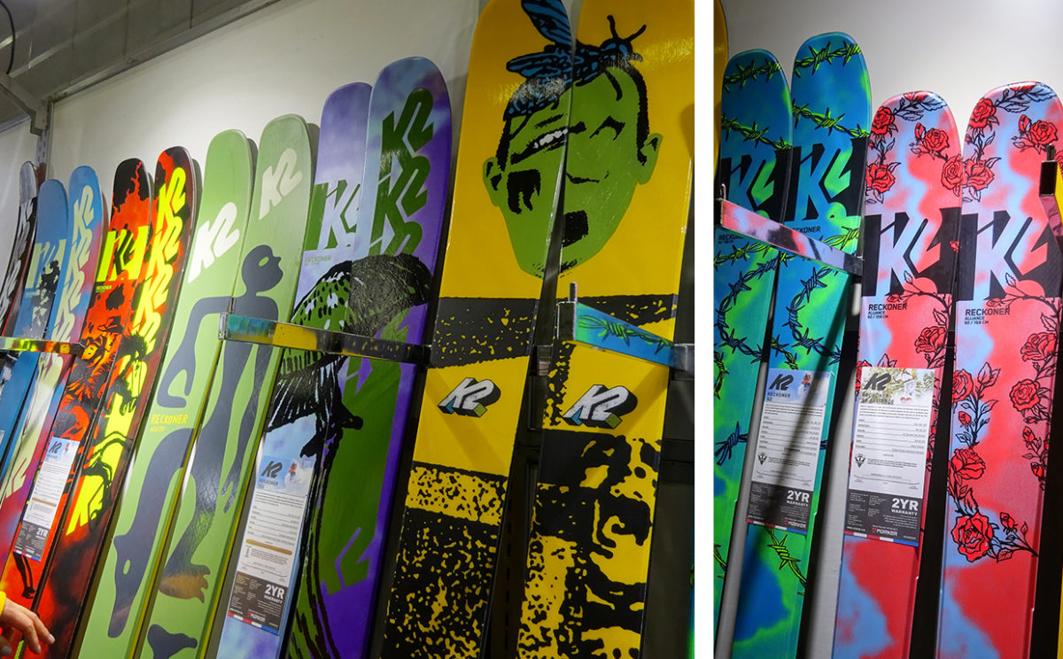 K2が近年、力を入れて展開しているのが、著名なアーティストとのコラボシリーズやリミテッドシリーズだ。11月28日にグローバルリリースされた「Jeremy Dean×K2」(写真左の黄色の板)に続いて、1月16日にリリースされたのは、待望だったGeoff McFetridgeとのコラボ作品「K2 Skis x Geoff McFetridge」(写真左の中央あたりの黄緑色の板)。このモデルは一番人気で、とてもよく動いているという。