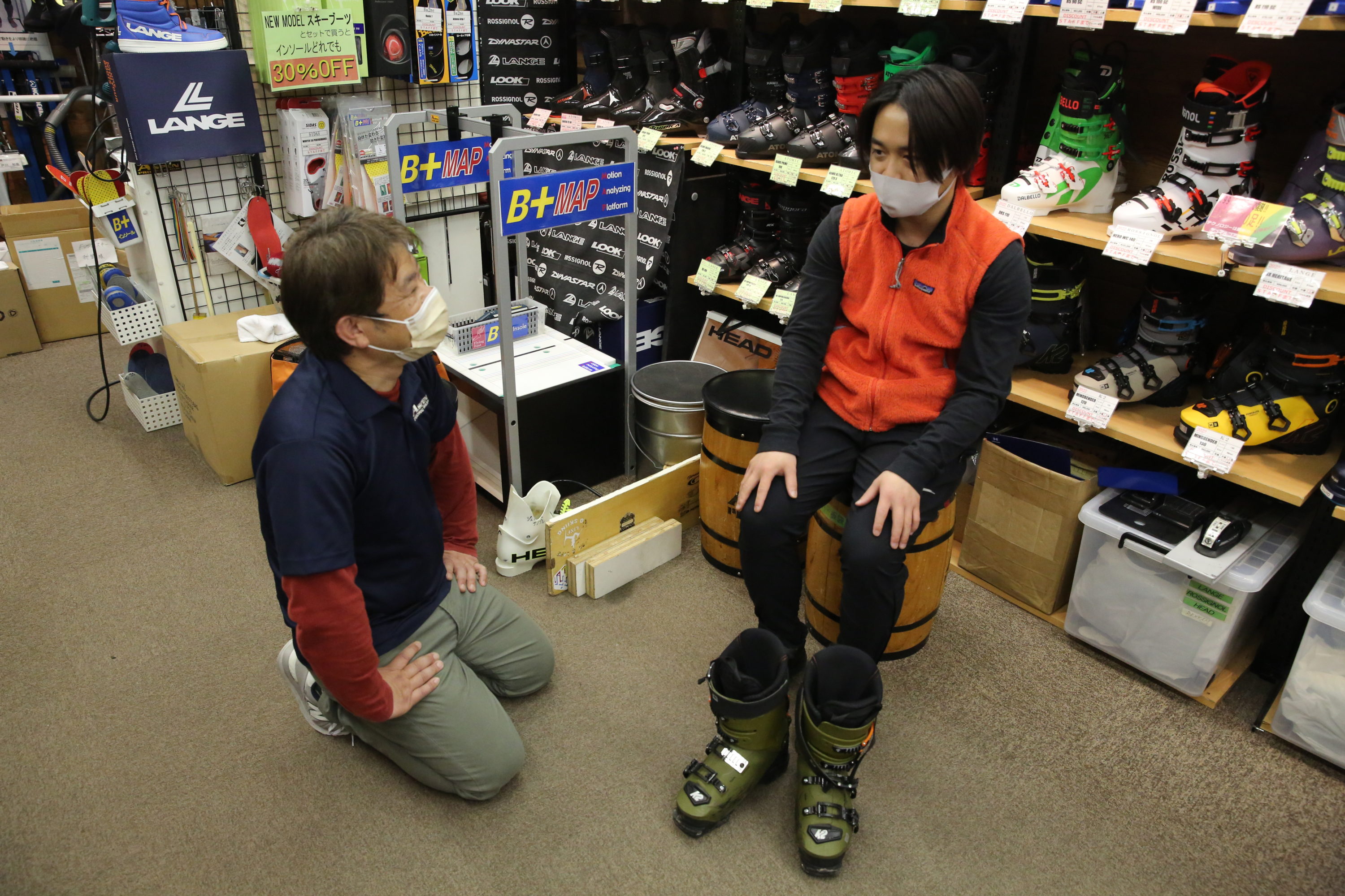 まずはフィット感に対してどのような悩みを抱えているのか相談! カスタムする必要があるか、インソールを変えたほうが良いのか。どのような滑りをするのか。専門のスタッフと相談して、どういった処置をするのか決めよう。