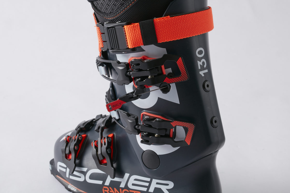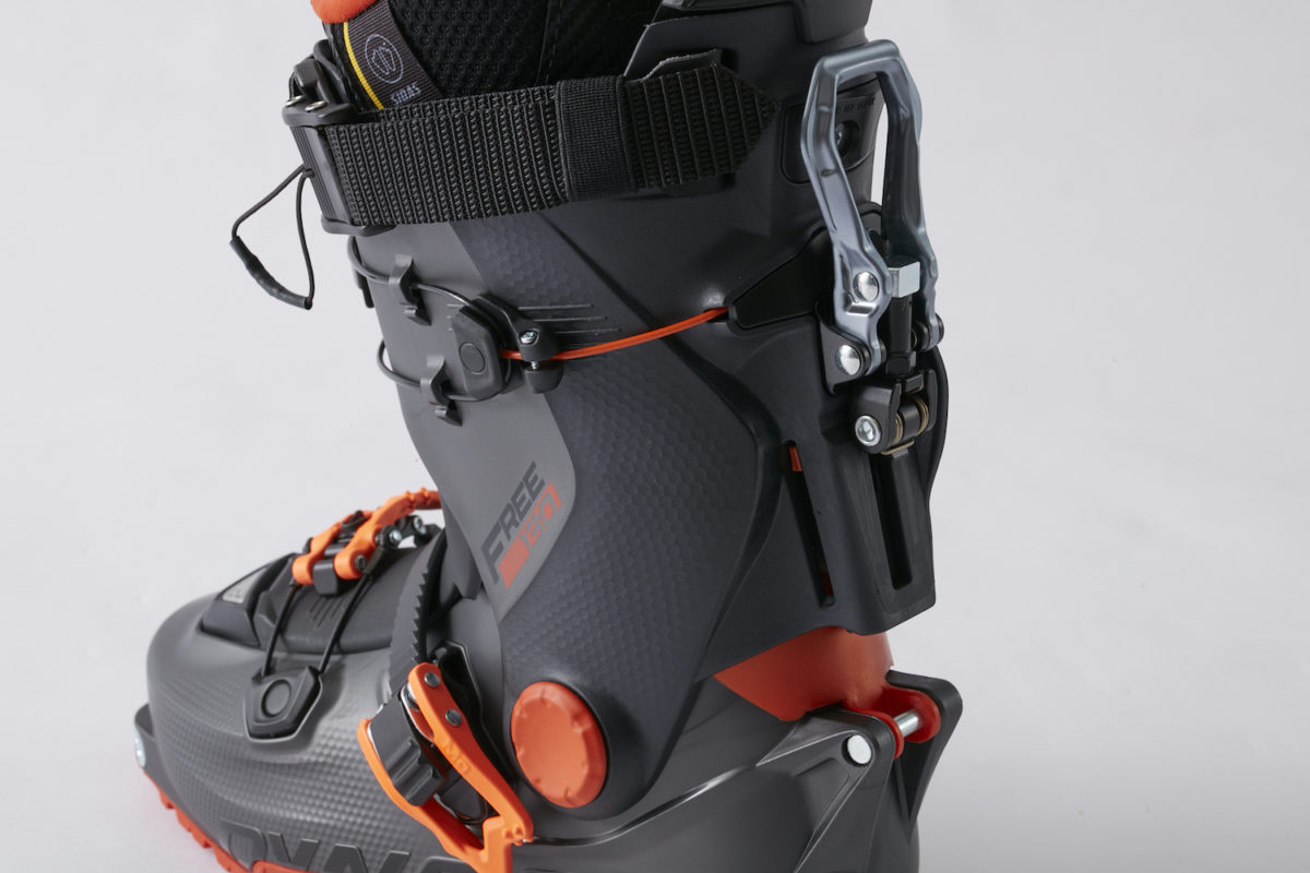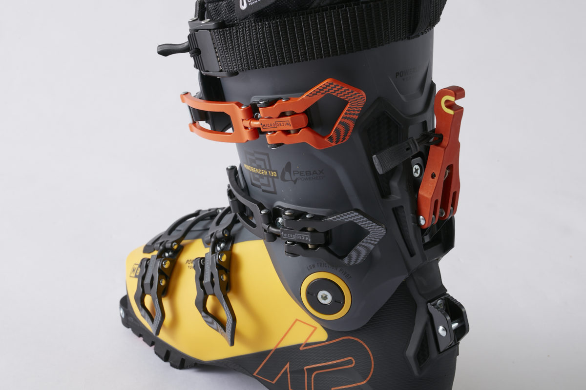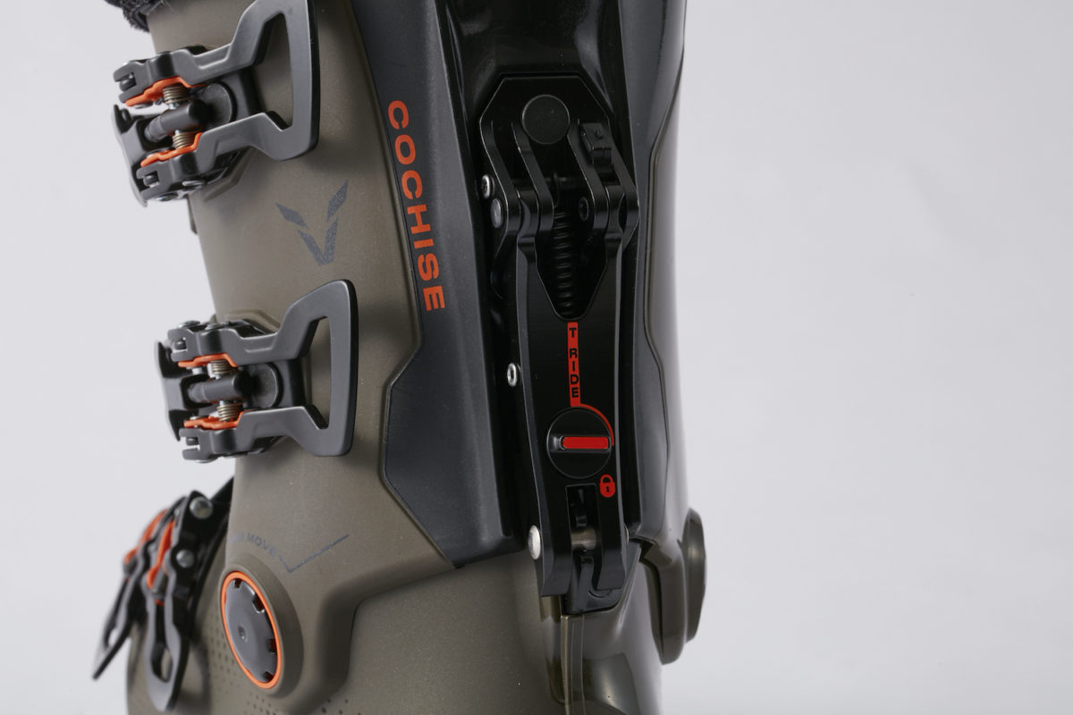 現在、ツアーブーツに限らず、多くのフリーライドモデルにウォークモードが搭載されている。モードチェンジするとロックが解除され、カフが前後に可動できるようになる。急斜面の登高や短い登りではあまり効果を感じないかもしれないが、斜度の緩い斜面や平地を進むときは、カフの可動域が広いほうが1歩ずつのストライドが大きく取れ、結果、速くて楽に移動することができる。