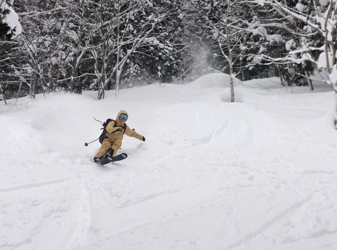 「乗り味はとにかく最高の一言。パウダーで一回乗ってしまうと、もう手放せません。使っているのは185㎝ですが、ツリーランのような細かい操作が必要な場所でも長さを感じません。飛んで回るのもパーク板のようにできるし、有効エッジが長いことで着地も安定します。カービングも楽しく滑れて、この一台で何役もこなせてます」