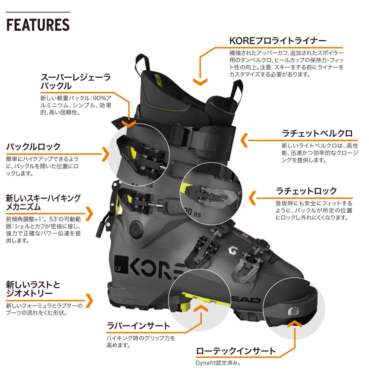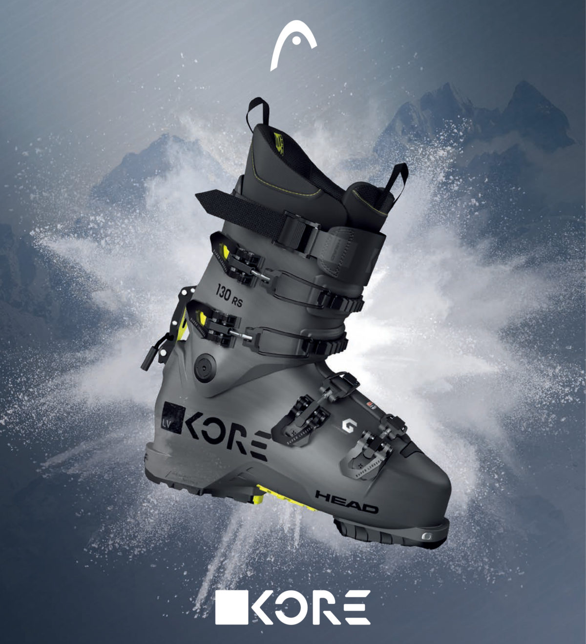 KORE RSブーツは、HEADのレーシングブーツテクノロジーの長所を活かしつつ、バックカントリーの環境下で求められる、優れたパワー伝達とレスポンスをもたらした。レーシングモデルのRAPTORやFORMULAの流れを汲み、98mmと100mmの2つのラストが用意されている。