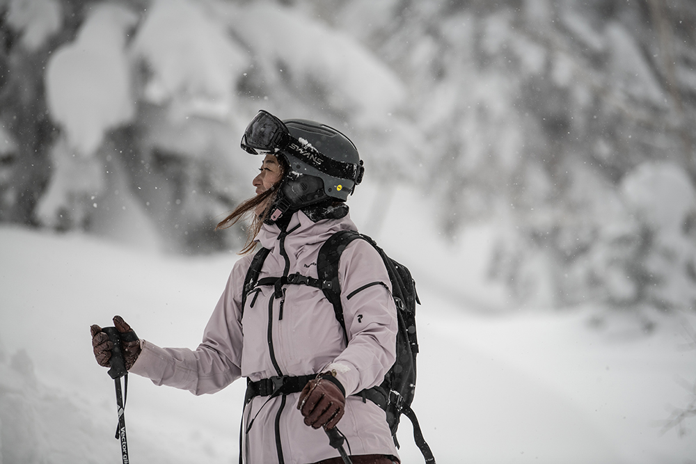 Gore-tex Strechを首元裏に採用することで、フード着用時の首回りの動きのストレスもない。肘周りに立体裁断を施し、激しい動きにも追従。滑走の追求に妥協のない機能性を提供するべくデザインされている。もちろん、ライドだけでなくハイクアップへの切り替えもシームレスだ。