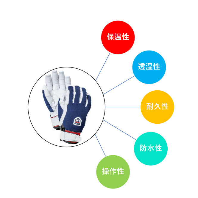 A. オススメは、HESTRAのLeather Woolですね。まず5本指なので扱いやすい。BCに不慣れだと雪上での道具を使うのにも苦労しますから。