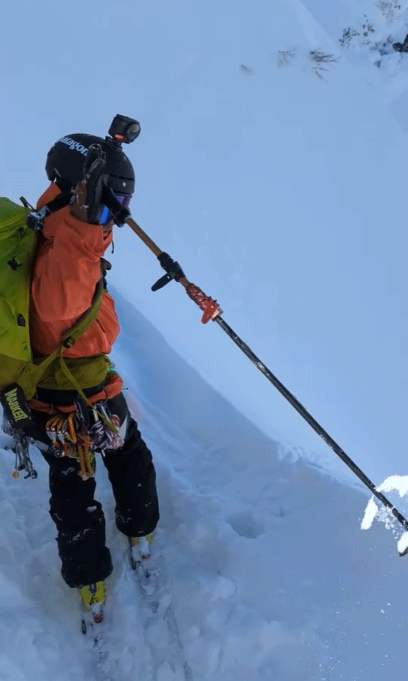 パークライドなどではポールを持たずに滑るスキーヤーも少なくないが、BCにおいてはポールにはたくさんの役割がある。例えば、このように…