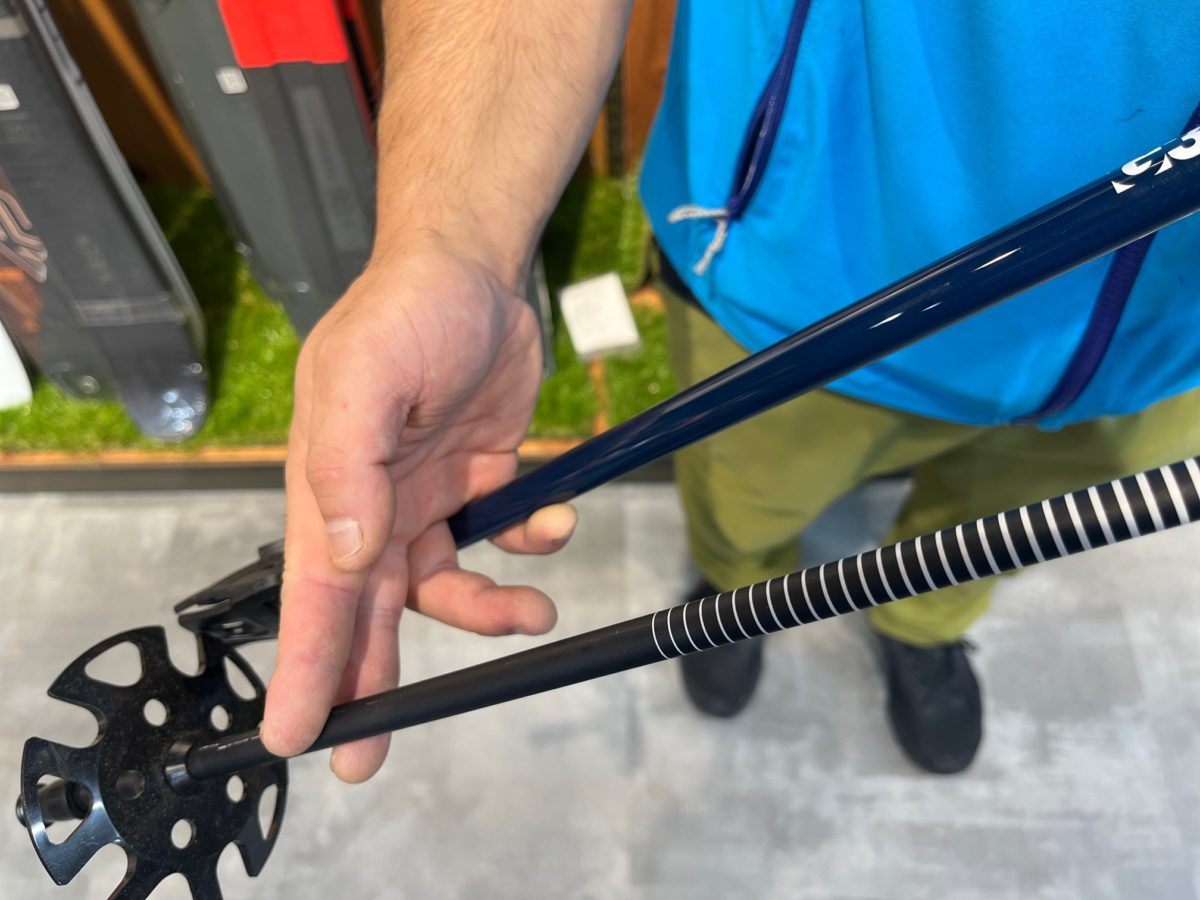 最近ではカーボンポールといっても中にアルミ合金の補強が入っていたり、正直なところストックを真っ二つに切ってみないとわからないことだらけなんですよね!(笑)山スキーモデルでは、上段シャフトと下段シャフトで素材を変えて強度とバランスを兼ね備えているモデルがたくさんあります。