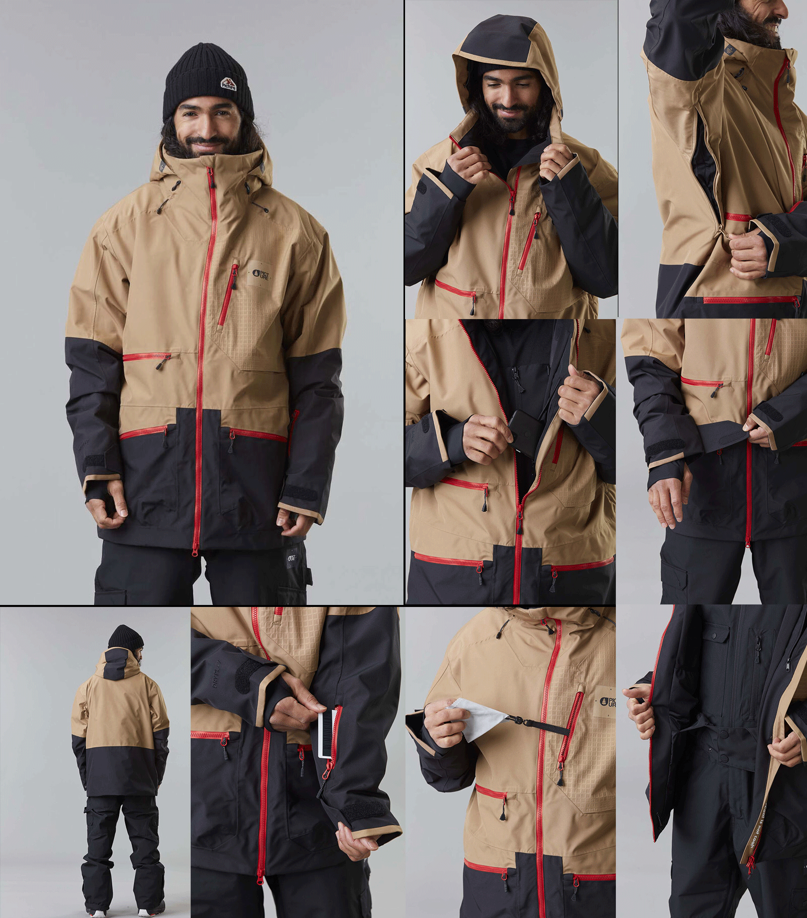 雪山でタフなフリーライディングをサポートする機能性にくわえて、PICTURE らしい個性あふれるデザイン性も大きな魅力。質感の異なるファブリックを組み合わせたり、白黒やアースカラーのナチュラルな配色をシンメトリー・アシンメトリーに配置し、カラフルなジッパーを組み合わせて、とてもスタイリッシュ。パークライドからバックカントリーまで、ジャンルを問わずに楽しめる作品だ。