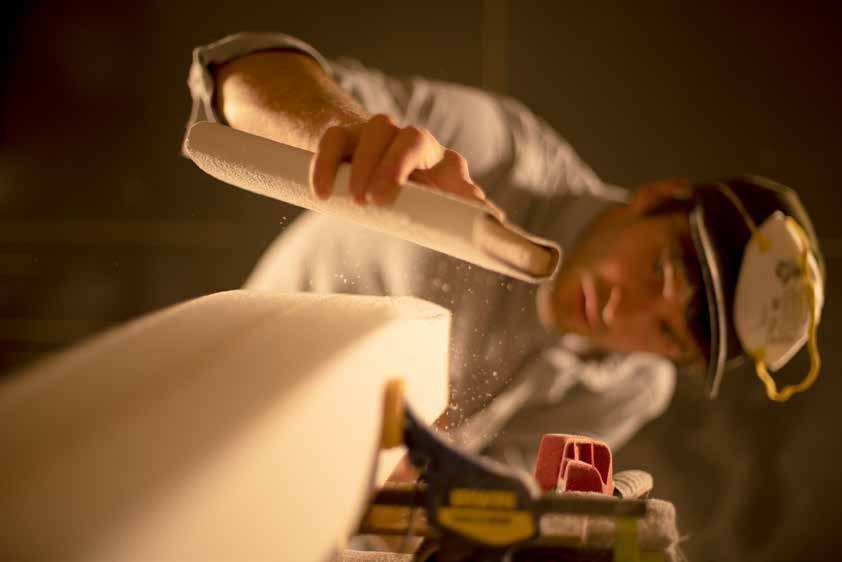 「LINE」の製品づくり全体をリードしてきたエリック・ポラード。このシリーズはスワローテール形状が目印の〈Fish Shapes〉とノーズとテールのソールが船底型(コンベックス)になった〈Surf Shapes〉の2タイプに分かれている。