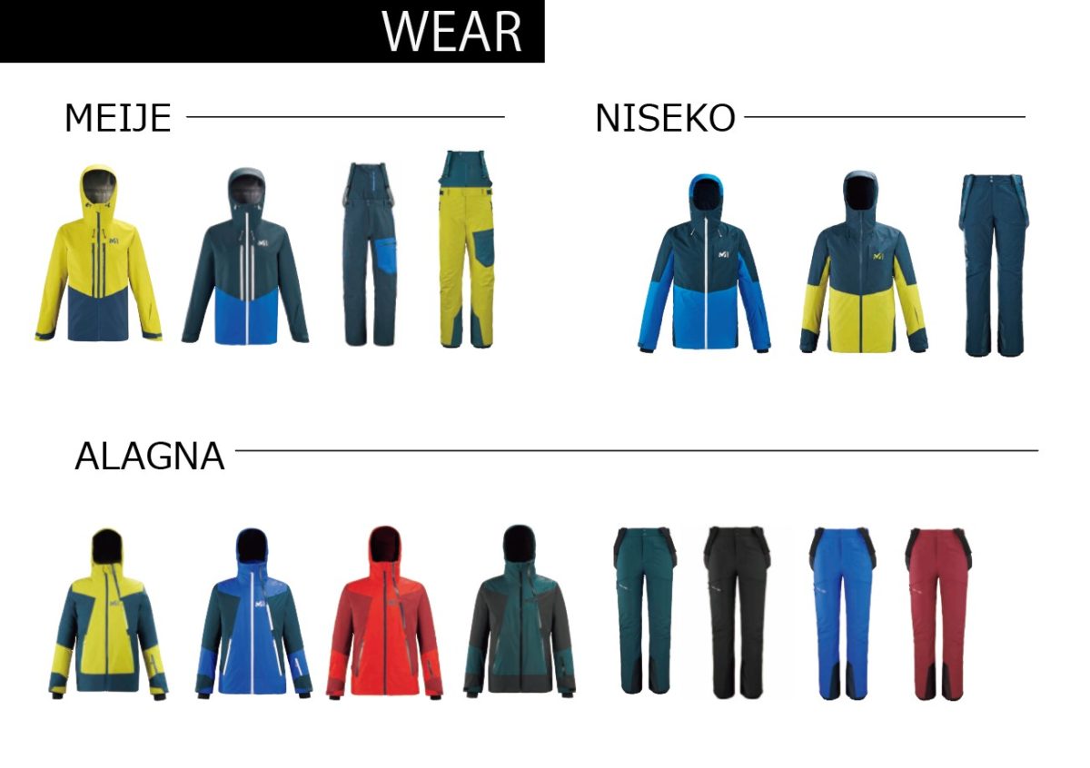 そうしたバックボーンをもつブランドのラインナップは必然的に、山岳エリアでの使用を想定した製品が中心になる。バックカントリーツアーに最適な「メイジュ」、バックカントリーやパウダーでの滑走を想定した「ニセコ」、雪山のあらゆる場所で快適に過ごせる「アラーニャ」。この3つのカテゴリーで雪山のでアクティビティをカバーする。