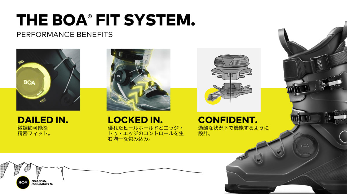 「BOAフィットシステム」はこれまでスノーボードブーツやゴルフシューズなど、さまざまなスポーツシューズに搭載している知識や経験を活かし、アルパインブーツ向けに新たなシステムを開発し、今回の発売までに5年以上の年月をかけて、満を持してお披露目となった。