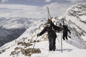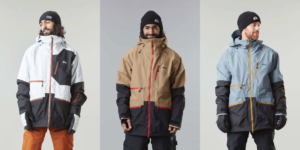 ジャケットとセットアップのビブパンツ。動きの激しい脚部の前面やビブ部分はストレッチ性の高い素材を採用、大きな胸ポケットやベンチレーション、調節可能なサスペンダーなど、バックカントリーに最適な仕様になっている。素材の異なる切り替えパターンのデザインも粋だ。