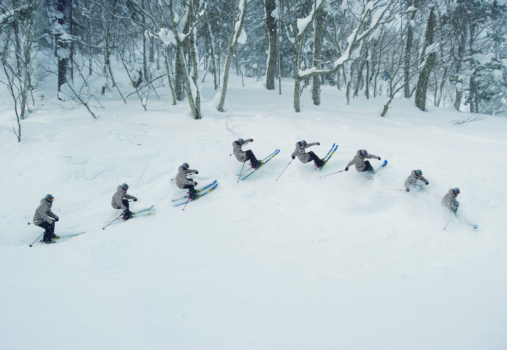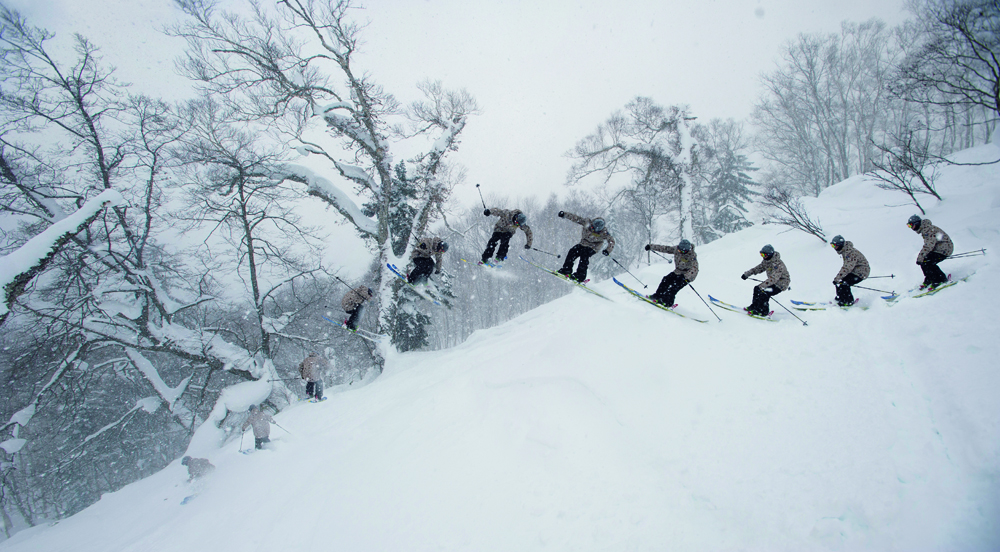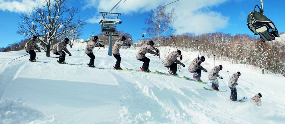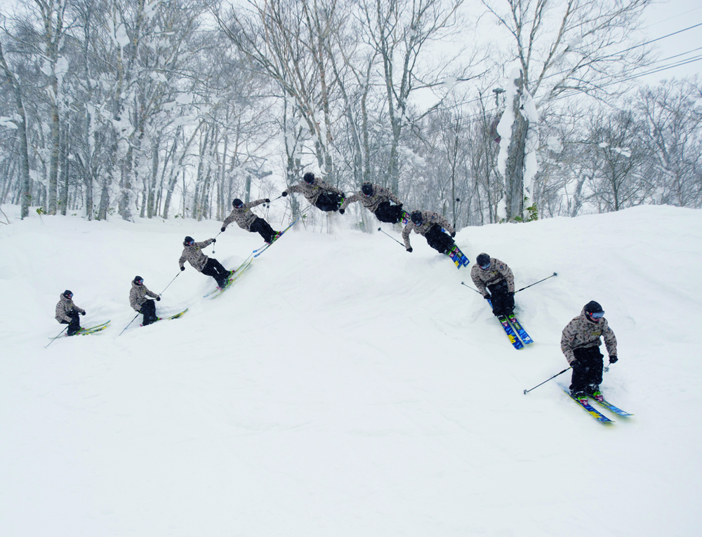 NO.7のヒップと似ているが、この場合は着地する時にスキーをほぼ90度横にしてスピードを殺し、スプレーを上げている。