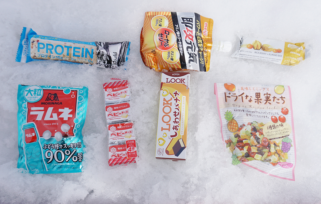 行動食は行く山によっていろいろだけれど、春山は行動時間が長くて長丁場と考えると、1時間に1回口に運べるものを細かく用意することをおススメする。かさばらず栄養価の高いもの、糖分の高いものや塩分がしっかり採れるものもいい。