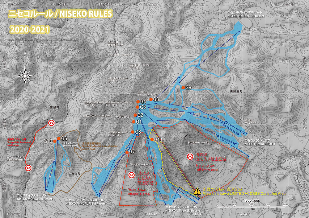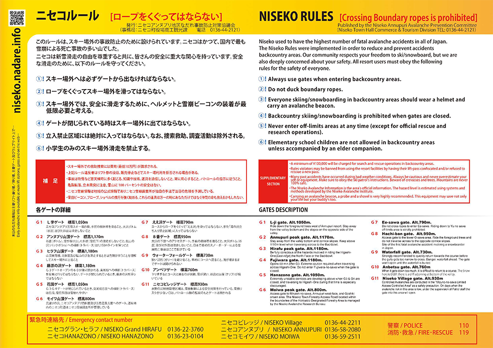 スキー場からのリフトアクセス可能なバックカントリーフィールドが増えてきた今、それぞれの地で作られているルールやマナーを守ることは重要だ。例えば、北海道・ニセコの5スキー場のゲレンデにはBCへのゲートが11か所も設けられており、各スキー場共通の「ニセコルール」がある。以下がそのルール、6か条だ。