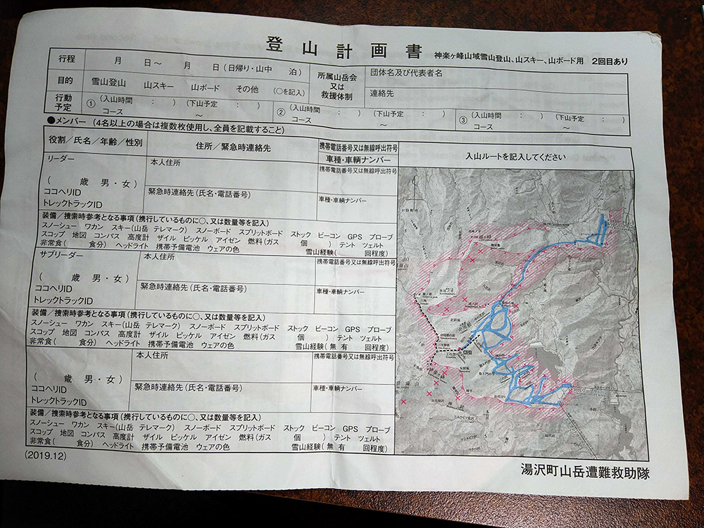 BCフィールドに入るには登山計画書を指定された場所に提出する必要がある。登山届けに決まった様式は無いが、各県の警察本部や山岳会、スキー場関係団体などでは所定の計画書を用意している。上の写真は、新潟県かぐらスキー場で利用されている登山計画書だ。ゲレンデトップ部のBCゲートで必ず提出が義務付けられている。