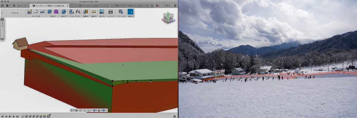 キッズパーク専用ゲレンデの横幅は55メートル、長さは95メートル。トロイカを降りてから緩やかな勾配によって横移動がしやすいので、どこからでも滑りやすくなっています。こうした自分のイメージを3Dキャドに落とし込めるライダーがいたので、パースに起こしてもらい、それを信州登山案内人の資格を持ちながら重機を操れる山城”ガチャ”喜也らが土を掘り起こしてキレイに整地しました。