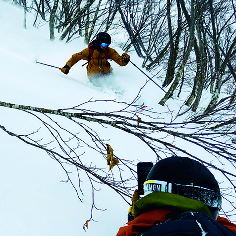 え? あれのこと? ほとんどが僕とセイジ(Sage Cattabriga-Alosa)のスマホで撮ったんだよ(笑)。最近のスマホって写真の画質すごいよね。一眼レフのカメラにも負けないくらい撮れちゃう。セイジといつも撮りっこしていたよ。アライの旅は、まさしくJAPOW(ジャパウ)がお腹いっぱい滑れて、大好きな温泉、美味しい日本食も満喫して、楽しい旅だったな。セイジとも久しぶりにセッションできて嬉しかった。