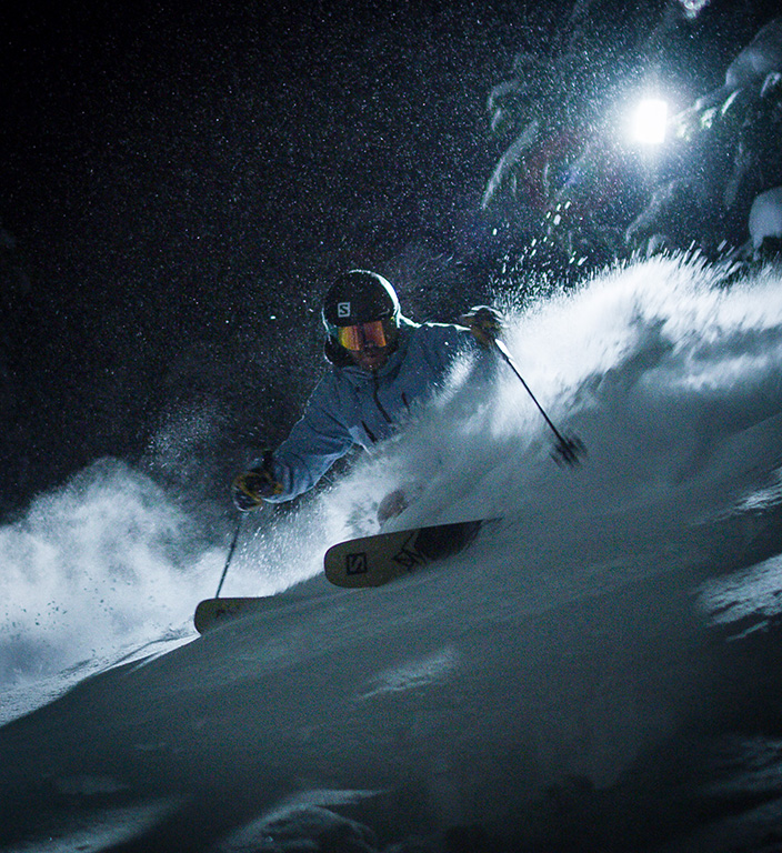 (笑)ああ。レーサーのようなカービングができるようになりたいんだ。だから今、テクニックを一生懸命勉強してるところ。普段はほとんどバックカントリーやパウダーを滑っているんだけど、ここしばらく山が雪崩のリスクが高いこともあって、ゲレンデでカービングの練習に熱中してるんだ。まるで勉強熱心な学生みたいにね(笑)。人も少ないから飛ばせていいよ。