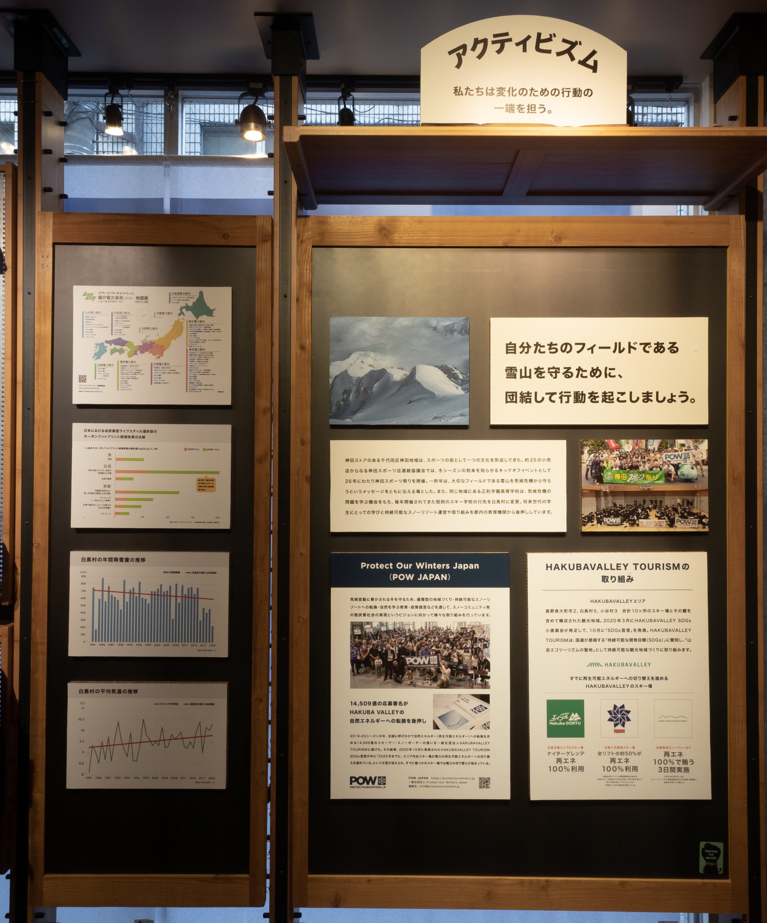 ボードでは一般社団法人 Protect Our Winters Japan(以下POW)や、それと連携する神田店の活動を紹介している。