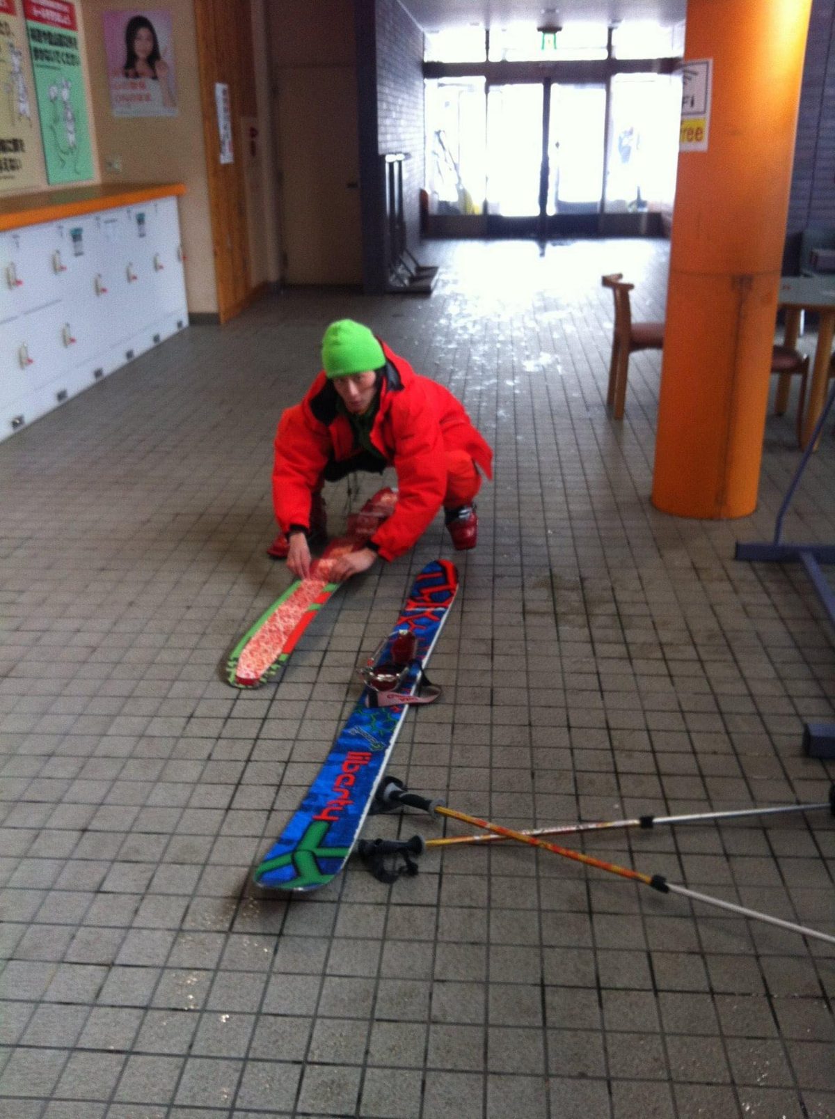 それまでスキーは一切したことがないのに先輩から『スキーやってみたい?』と聞かれて『はい』と答えたら、これを買ったらいいとヤフオクでテレマークスキーを買わされました。それがフィッシャーのワテア78っていう板、ブーツ込で3万円。ウエアは先輩が着ていたコロンビア。テレマークはまったく知らなかったので、自分のスキーだけカカトが上がるんで『大丈夫すか!?』って先輩に聞いていたくらいのノリです。それからずっとテレマークをやっています」