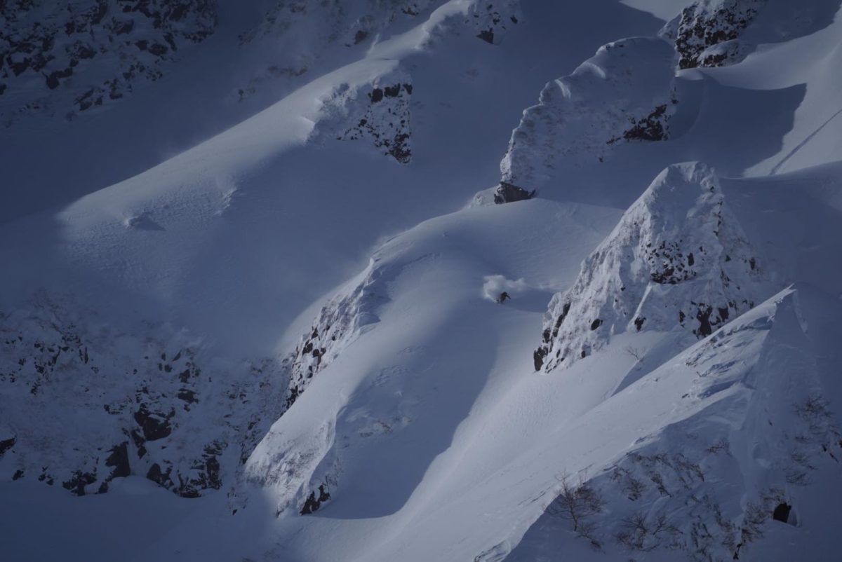 千葉「標高差は700mくらい。羊蹄山には及ばないですけど、一本のラインとしてはかなり長い方。最初、ピーク付近にいい発射台が2発あって、そこを飛んで、中盤はラインが分かれ、細いラインへいったり、広い一枚バーンへ行ったりできます。