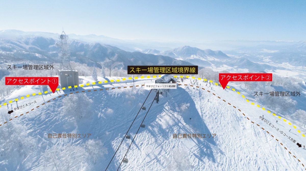 「毛無山の山頂からちょっと降りたところ、青木の方面に降りていく始点に、ゲートのような‟アクセスポイント”を2カ所設置したんです。そこから先はスキー場の管理区域外でバックカントリーとの境界という意味です。バックカントリーを滑りたい人は、登山届けを出して、必ずこのアクセスポイントから出てもらっています。