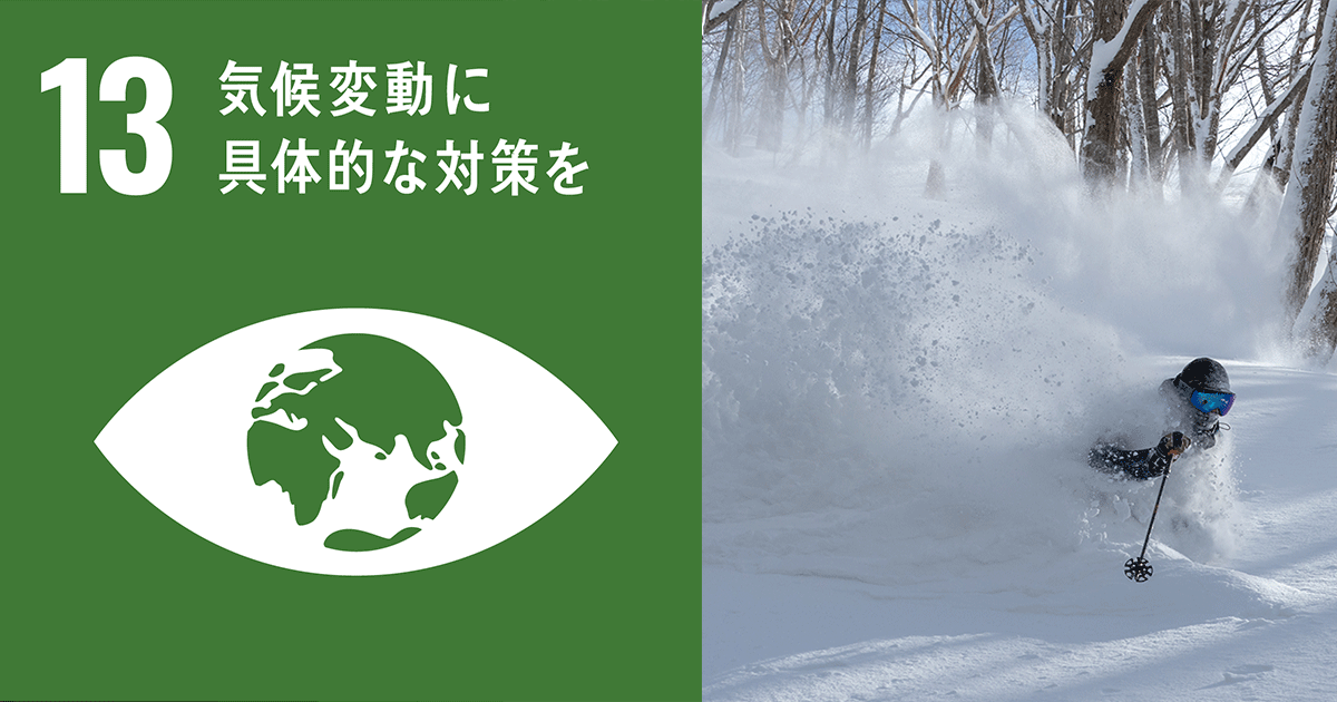 SDGsの目標(13)「気候変動に具体的な対策を」は、温室効果ガスの排出が原因で地球温暖化による”気候変動に具体的な対策”を打ち、地球温暖化を少しでも食い止めることが目標となっている。「雪があまり降らなくなったら、雪山で今のように遊べなくなってしまうのではないか?!」これはストレートにわかりやすくスノー業界や滑り手に結びついているテーマだ。