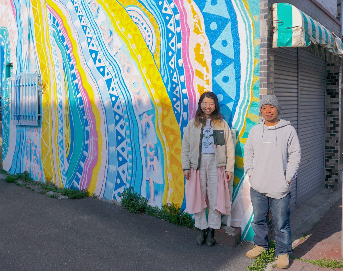 スノーボーダーでありアーティストの仁科正史が描いた大町市街地の壁画をバックに並ぶ2人