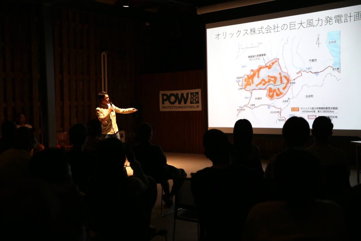 続いて、フライ・ルアーフィッシングエリアBIG FIGHT松本の松本新さんによる伊達の大滝地区での大規模な風力発電所の建設計画についてのプレゼン。大規模な風力発電や、メガソーラーの建設などは、再生エネルギーという大義のもと、その建設自体が大きな自然へのインパクトになり、問題解決の方法で新たな問題を作り出しているという。今回の大滝地区での開発も、まさにそれにあたり、地域住民は施工元のオリックス株式会社に大きな不信感を抱いているという(オンライン署名サイトはこちら)。