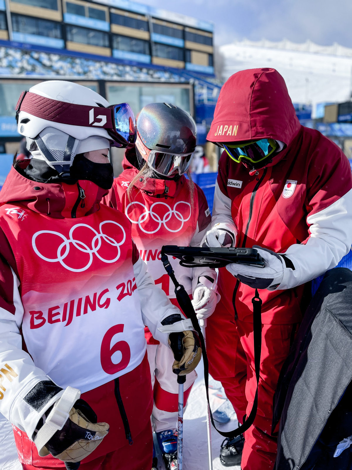 滑りはすぐにタブレットに取り込み客観的に映像をみて改善点を洗い出す。左は富高日向子、真ん中が川村あんり。北京五輪での一コマ Photo/Janne Lahtela