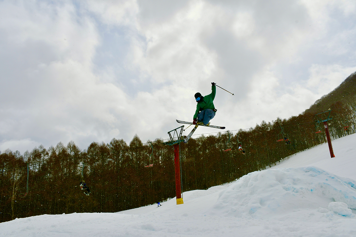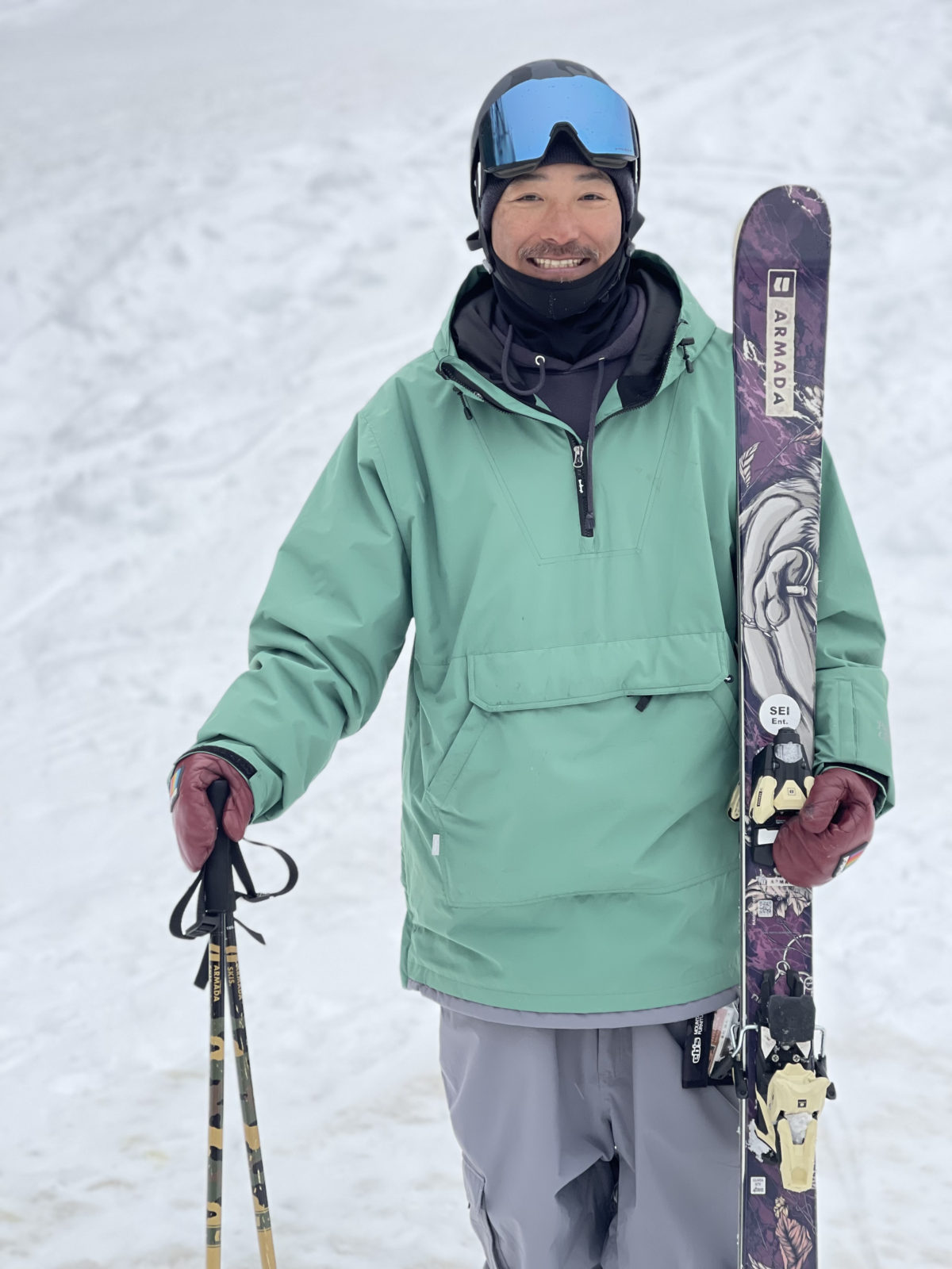 元々は両親がスキーバカで、その影響を受けました。東京に住んでましたが、妙高に移住してペンション経営を始めてしまうほどで…。幼少期から両親に無理やり雪山に連れて行かれて、ビービー泣いてましたね。妙高への移住をきっかけにスキーが日常になり、基礎スキーをキッチリやり、インストラクターのバイトをしながら準指導員を取得しました。20年ほど前にスキーをバッテンにしてジャンプしてる人を見て、それが「フリースタイルスキー」だと知り、ツインチップを買い、今に至ります。