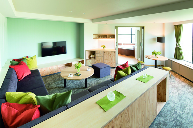 客室は6名まで泊まれる120㎡のスイートなど多彩なバリエーション。広々とした展望ジェットバスは全室に設置され、入浴時間を制限されないのもうれしい
