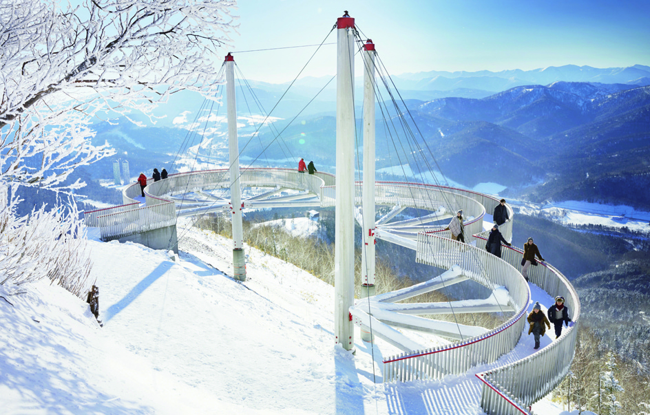 山麓から雲海ゴンドラで13分。標高1,088mにあるのは雄大な日高山脈を望む「霧氷テラス」。写真は雲型の展望スポット「クラウドウォーク」で、テラスは12月25日まで夜間ライトアップも実施!
