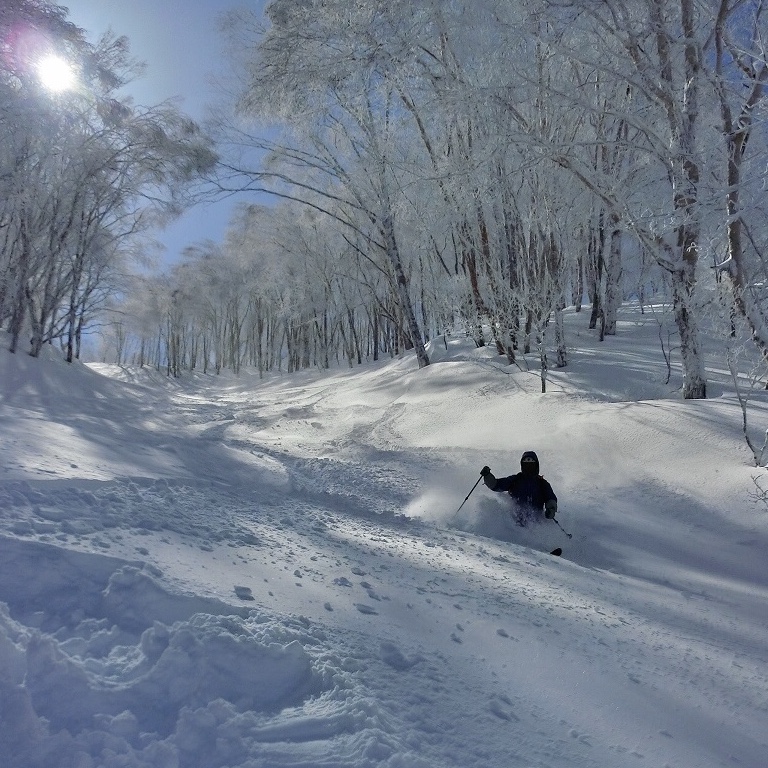最大斜度36度、全長約1,400mの超ロングランが非圧雪で楽しめるという、パウダー&スティープ好きな滑り派にとっては夢のようなコース。地域特有のドライパウダー、北西斜面、沢地形、ツリーもあり、とんでもなくゴキゲンなスポットだ。
