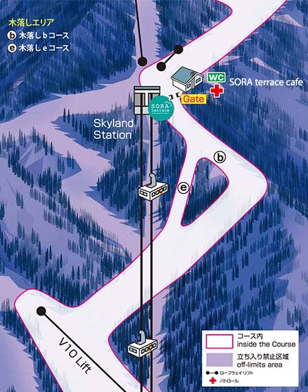上級者限定のエリアとなり、滑るには事前に講習会の受講が必要(指定日のみ、受講費3000円)朝イチに45分の講習を受け受講証明書をもらい、ヘルメット着用して初めてコースに入れる。コースは3カ所が点在。圧雪されたコースでは体感できないパウダーライドが楽しめるとあって大人気だ。