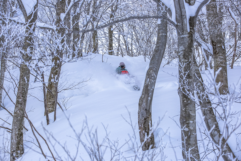 ローカルの間では密かに知れ渡っていた山頂エリアのツリーラン。今季、オフィシャルに山頂エリアと中腹エリアの2カ所に非圧雪のツリーランエリアが開放された。これで降雪のあったときは堂々と思う存分にパウダーが楽しめる。嬉しくてたまらない。