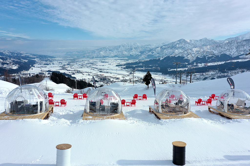 まず注目なのが、写真のスノードームテント。コロナ禍の今季、これほどタイムリーなものもないだろう。個室でゆったりと、美しい雪景色を眺めながらくつろげるという贅沢さ。この特別感と安心感が実にいいとオープン直後から人気殺到となっている。