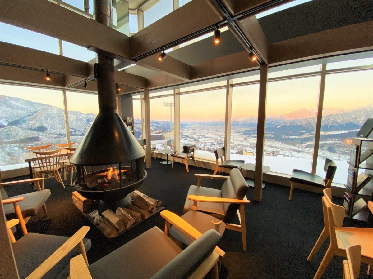 日墺友好150周年を記念して’18‐19シーズンにオープンしたヨーロッパチロルの雰囲気あふれる「オーストリアスノーハウス」。窓いっぱいに広がる魚沼平野や越後三山のパノラマビュー、暖炉の炎には身も心も暖まる。寒い吹雪の日などには救いの暖をとる逃げ込みスポットになる。