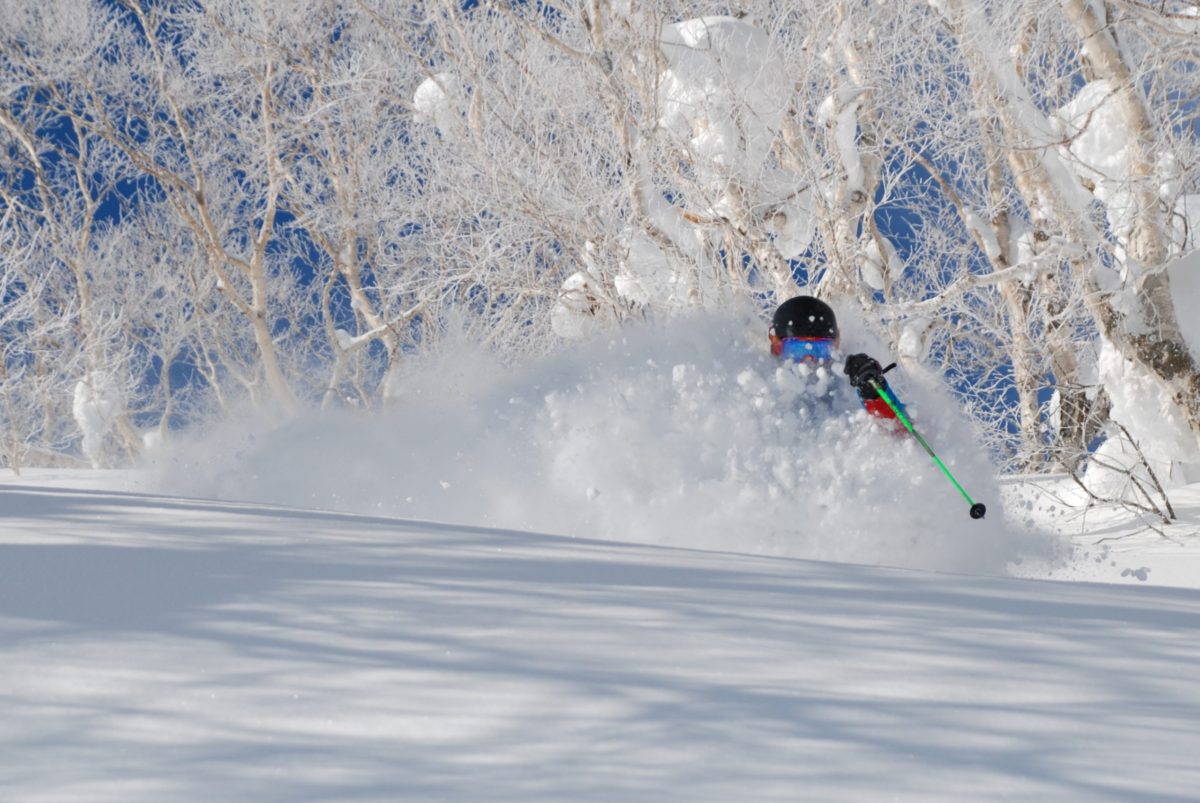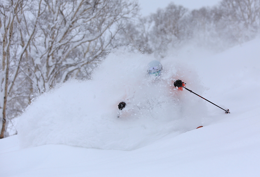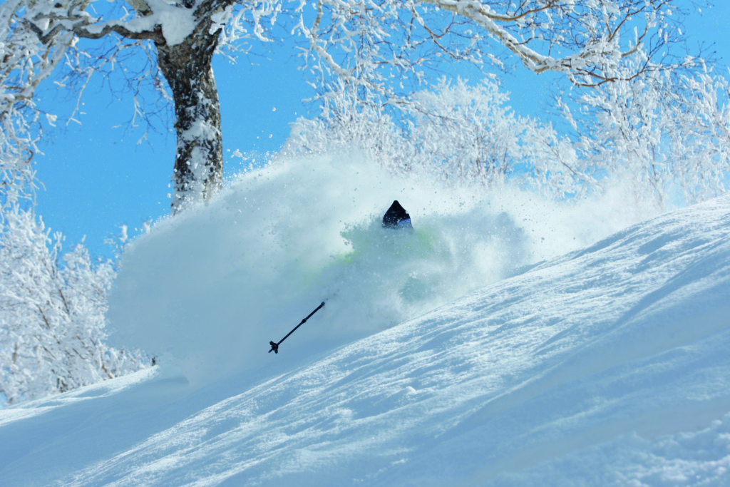 というのも、ニセコグラン・ヒラフはコース名は付いていないが、見晴らしコース他、ツリーランポイントは非常に多い。あちこちで自然に木がたくさん生えていて、その中を自然に滑ることができるし、コース脇でも楽しめる。どこでもそれぞれの滑走レベルに合わせたツリーランにチャレンジできるのが魅力だ。上の写真もそんなシチュエーションでの一枚だ。北海道の緯度の関係で森林限界が低いため、標高がそれほど高くないスポットでも木々の間隔が密過ぎない。これも北海道のスキー場は総じてツリーランが楽しめる理由のひとつ。